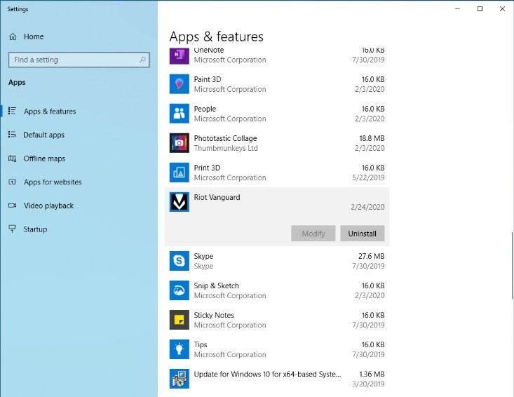 Scroll till you come across Riot Vanguard, click on it, and then click Uninstall. You'll be prompted to click Uninstall again in a pop up window to confirm your choice.