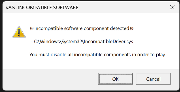 Nếu bạn thấy thông báo lỗi "VAN: INCOMPATIBLE SOFTWARE" (VAN: PHẦN MỀM KHÔNG TƯƠNG THÍCH) thì điều đó có nghĩa là một trong các tệp trình điều khiển của bạn không tương thích với Vanguard.